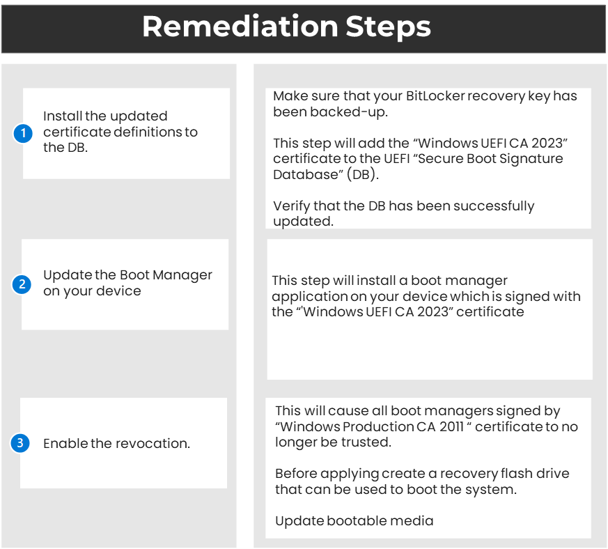 | Current trust anchors Microsoft Windows Production PCA 2011 currently used to authorize trust for all Windows boot managers in Secure Boot will expire in 2026 | [Optionally] revoke trust in the Windows Production PCA 2011. |
