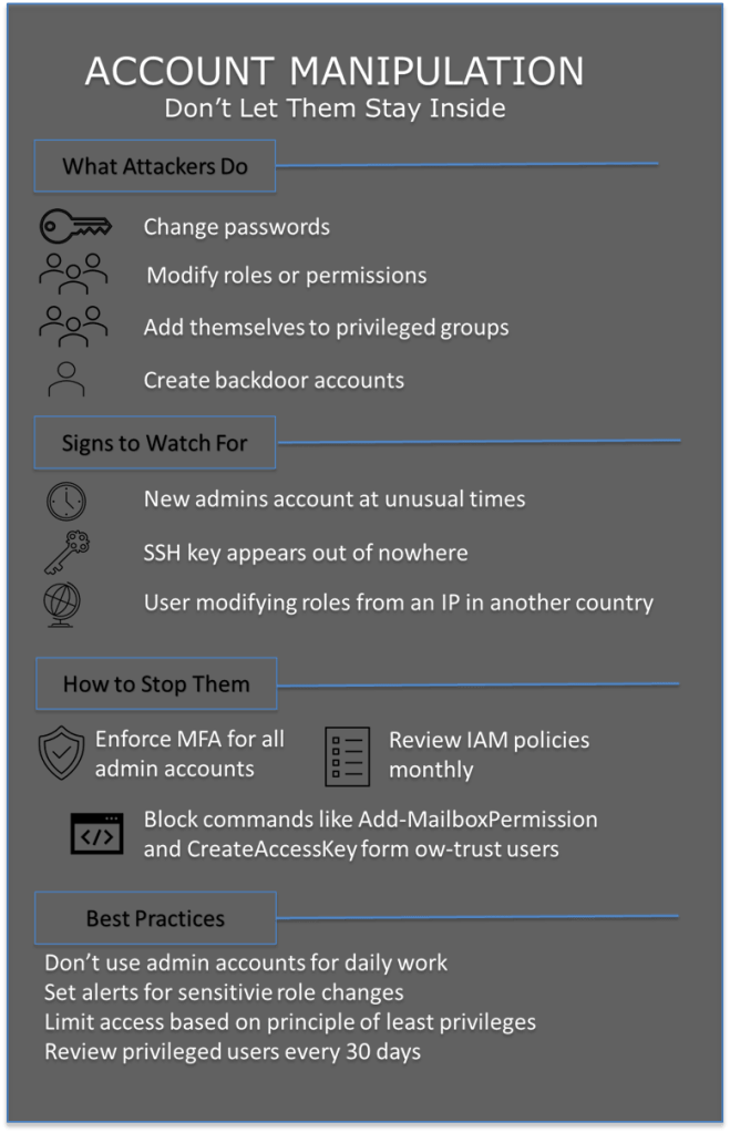Account manipulation is not always obvious. It doesn’t require zero-days or loud lateral movement—it’s a quiet, methodical process. Attackers rely on blending in and exploiting gaps in identity management.